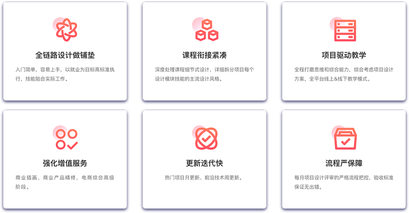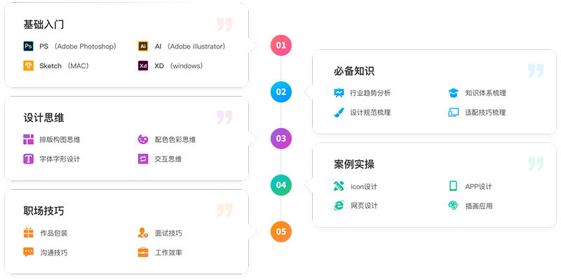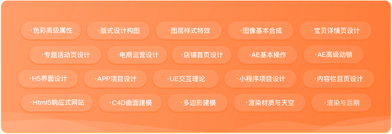 課程分為五個(gè)階段學(xué)習(xí),分別為軟件基礎(chǔ)階段、人像后期+插畫(huà)階段、電商初級(jí)階段、電商升級(jí)階段、網(wǎng)頁(yè)設(shè)計(jì)階段等課程內(nèi)容,從軟件到實(shí)操,從思維到全局統(tǒng)籌,360°無(wú)死角的學(xué)習(xí)體系,從學(xué)習(xí)、實(shí)踐、應(yīng)用多層面夯實(shí)UI核心技能。