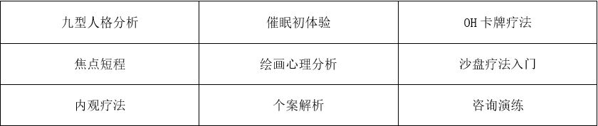 安娜老師在咨詢及講課中積累了豐富的經(jīng)驗(yàn),并善于運(yùn)用多種心理咨詢技巧,如沙盤、繪畫、卡牌、焦點(diǎn)、內(nèi)觀、TA、森田、催眠、九型人格、象棋咨詢法(曲偉杰先生創(chuàng)立)等。
