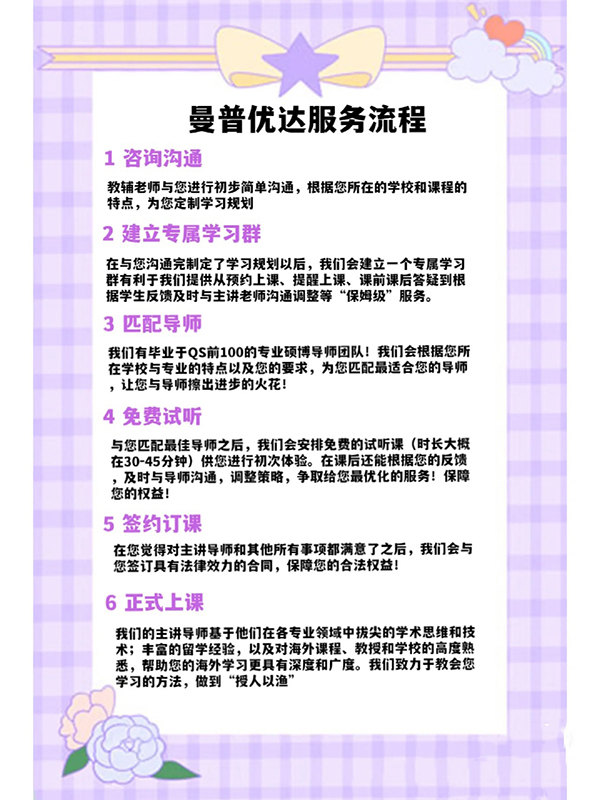 曼普優(yōu)達基于碩博團隊的過硬學術能力與留學經驗,致力于為學生提供從學術硬實力到背景軟實力的全面實際提升,幫助學生在自信,安心升學留學的同時,為日后的學術生涯打下牢固基礎。