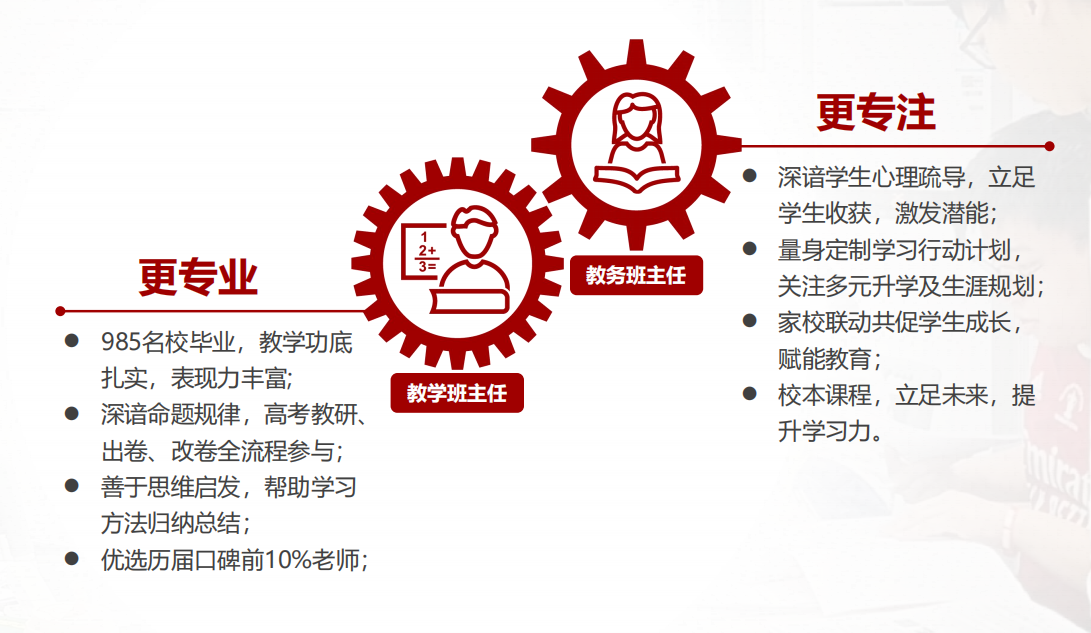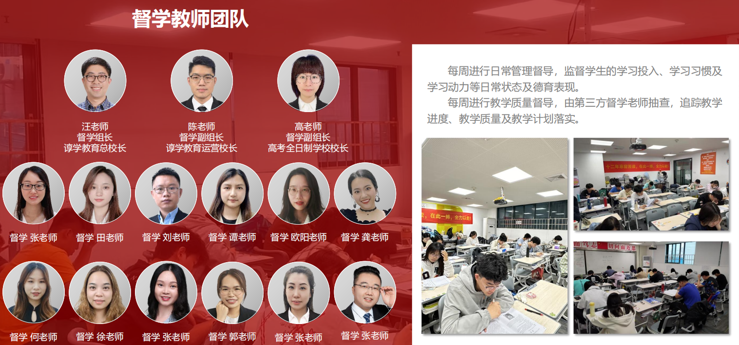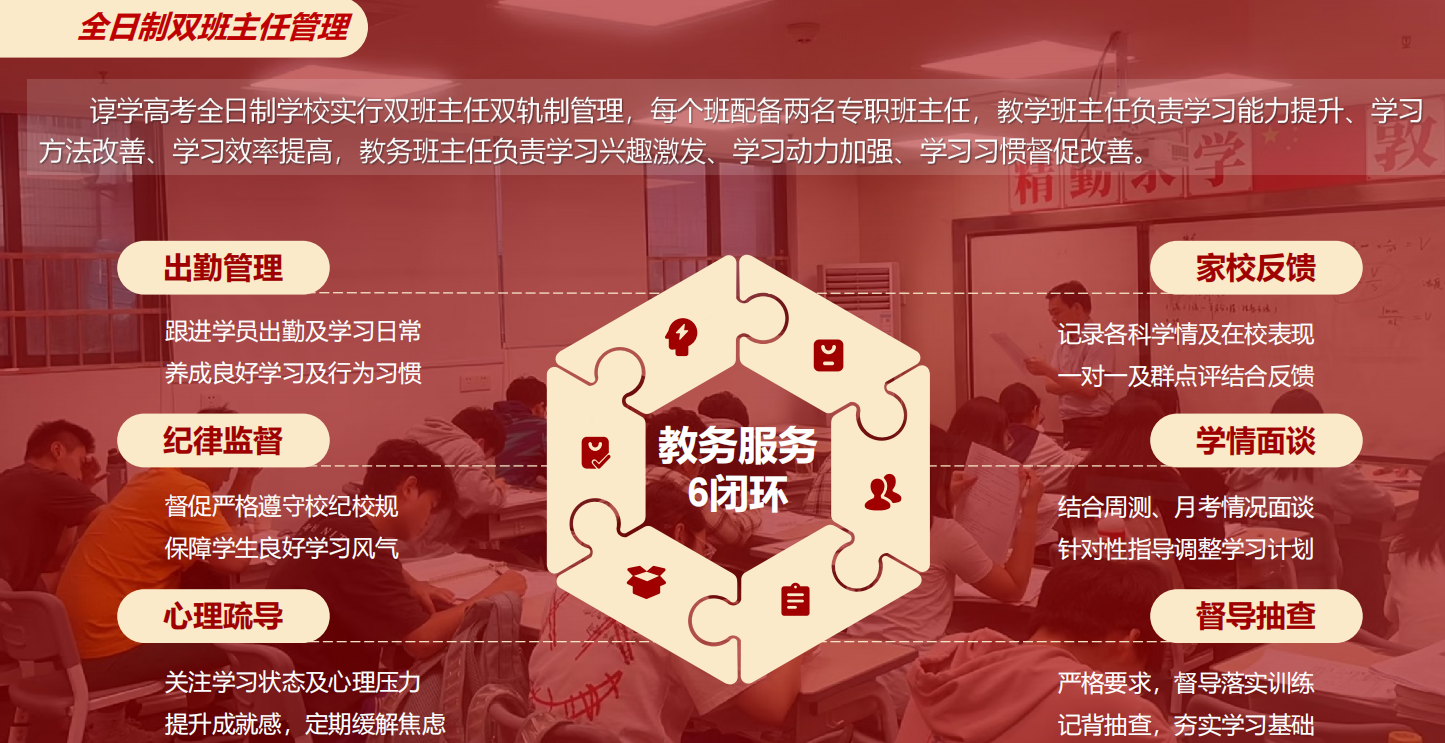 諄學高考全日制學校實行雙班主任雙軌制管理,每個班配備兩名專職班主任,教學班主任負責學習能力提升、學習方法改善、學習效率提高,教務班主任負責學習興趣激發(fā)、學習動力加強、學習習慣督促改善。
