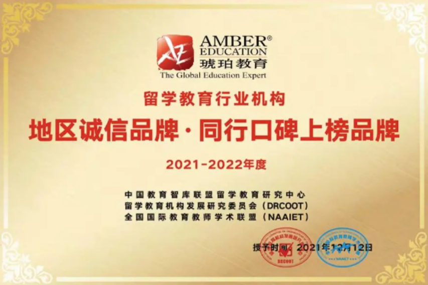 2021年12月,琥珀教育受邀參加“2021第六屆全國留學(xué)教育行業(yè)年會(huì)(廣州)”,并憑借二十多年的誠信經(jīng)營與專業(yè)服務(wù)榮獲“全國留學(xué)教育行業(yè)地區(qū)誠信品牌·同行口碑上榜品牌”!
