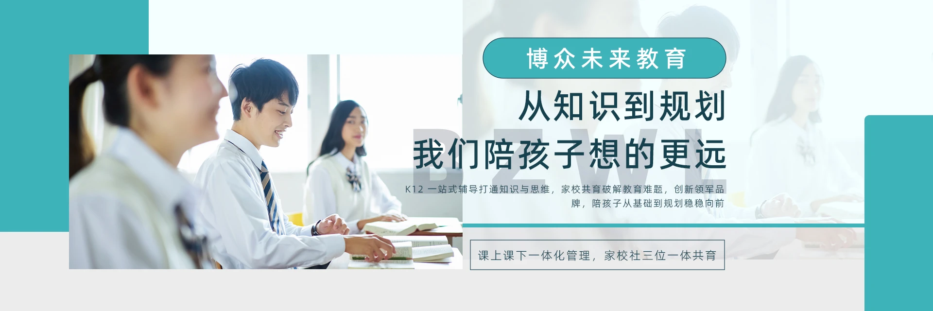 博眾未來教育致力于為K12基礎教育學生提供高品質一站式綜合輔導,內容涵蓋知識、思維、方法和規(guī)劃,旨在幫助學生在課上高效提升,課下有效吸收。我們注重一體化管理,并指導家長做好學生志愿規(guī)劃和家庭教育,構建內外循環(huán)的教育管理體制。博眾未來教育是深受家長和學生信賴的中小幼課外輔導品牌。在2018年,我們被提名為“中國科技管理創(chuàng)新領軍企業(yè)”。2019年,被提名為“中國民辦教育聯(lián)盟常務理事單位”和“中國民辦教育創(chuàng)新示范單位”。我們的教育理念是:培養(yǎng)思維、關注心態(tài)、樹立科學人生觀。企業(yè)愿景是:好老師、好成績、好未來,做最受信賴的教育企業(yè)。企業(yè)價值觀是:成就家庭、用心做事、創(chuàng)新開拓。