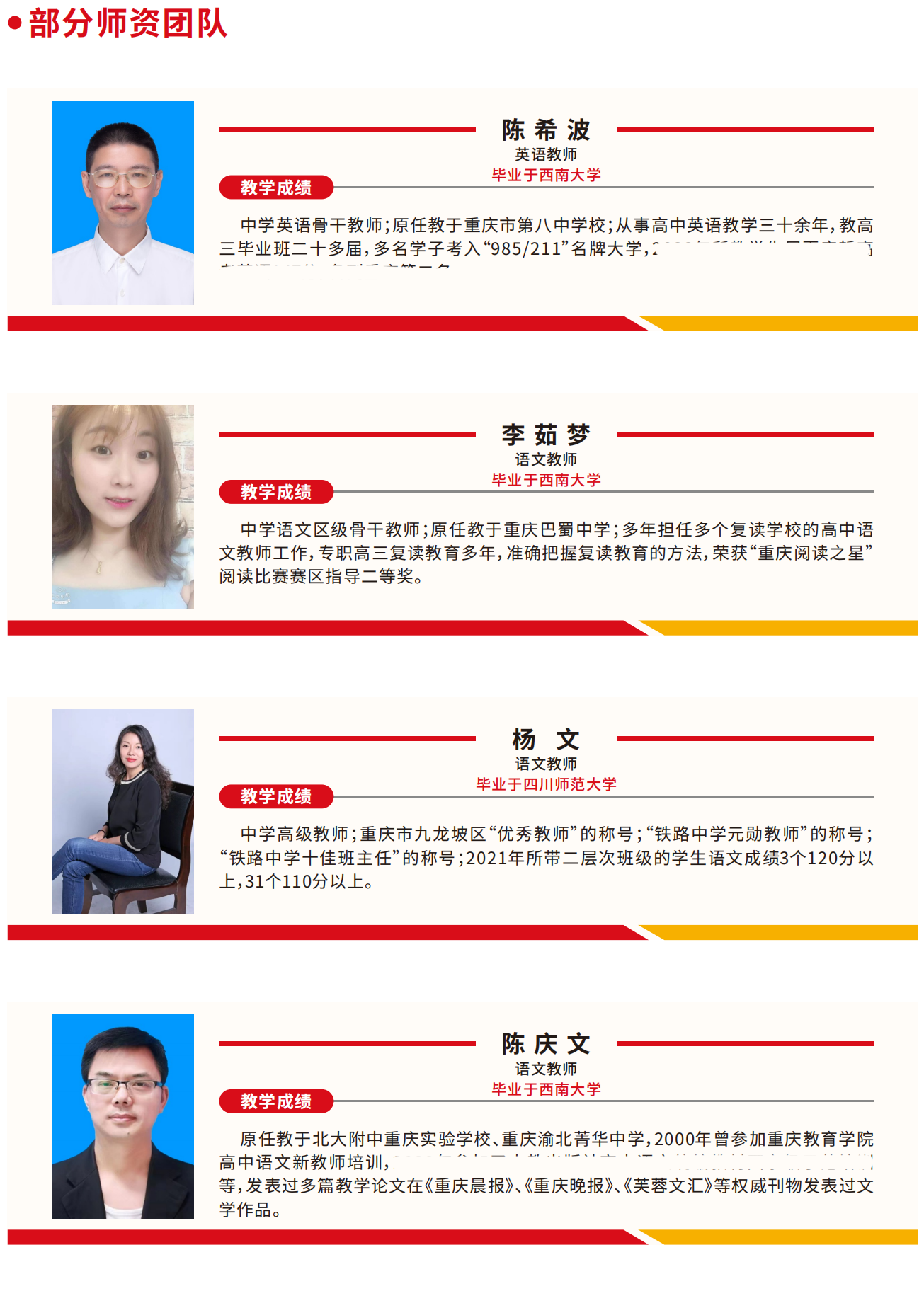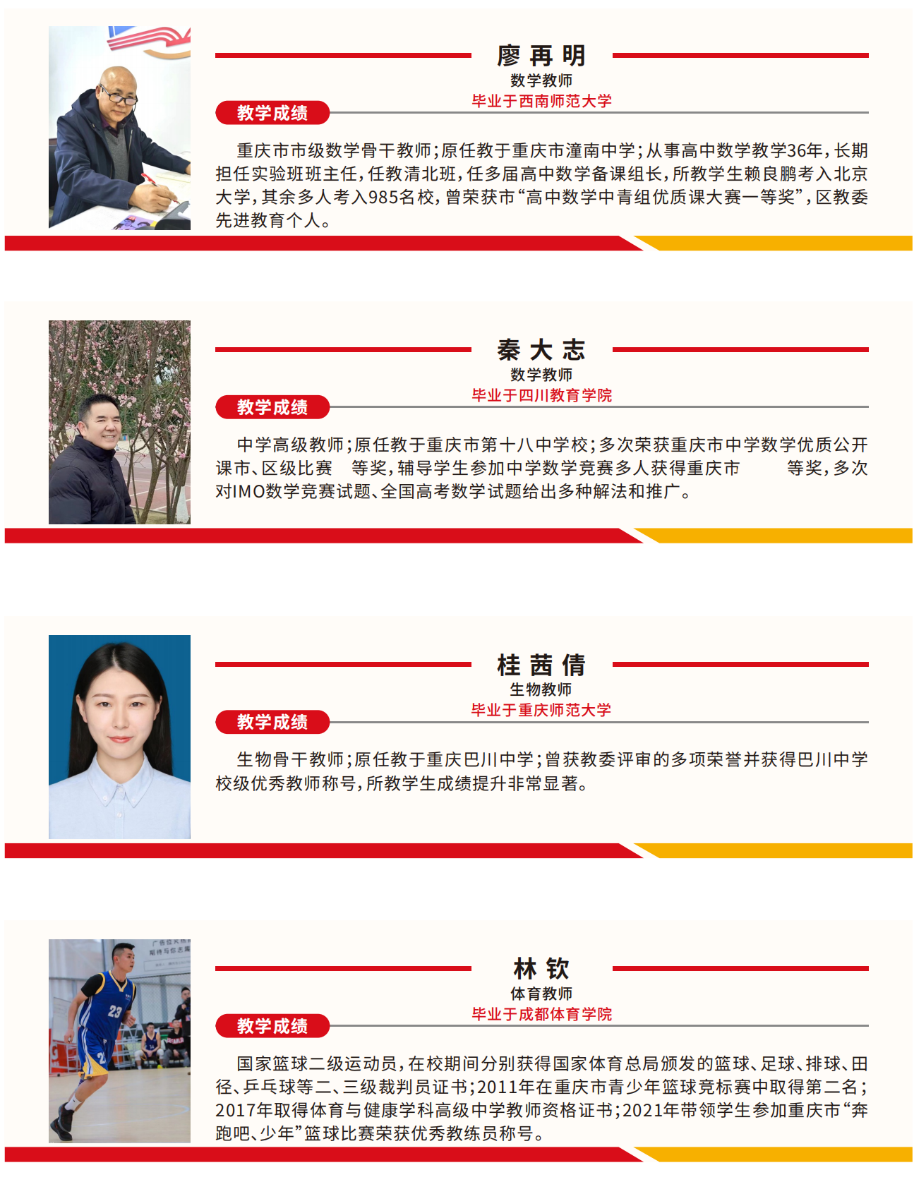 學(xué)校擁有精良的師資隊伍,三分之二的教師來自重慶市重點(diǎn)中學(xué)并有著豐富的高考教學(xué)經(jīng)驗,另有部分市級骨干教師和市級學(xué)科帶頭人為學(xué)子把脈問診。學(xué)校擁有嚴(yán)謹(jǐn)且有特色的管理體系。教學(xué)管理上,堅持“分層教學(xué)”,做到因材施教、因材施策,彰顯個性、塑造特色。德育管理上,學(xué)校堅持“五育并舉、德育為首”,